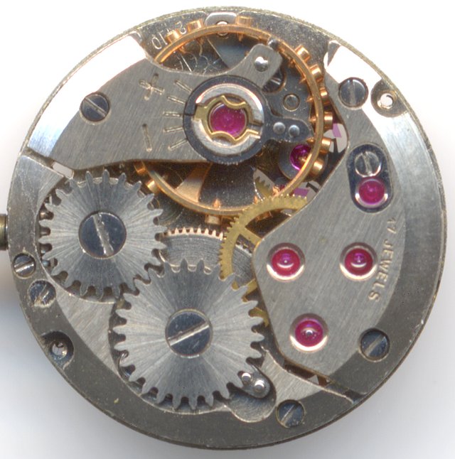 Die Konstruktion des Räderwerks war seinerzeit, um 1960, revoutionär, verzichtete sie doch auf ein zentrales Minutenrad und konnte deswegen ein großes Federhaus und eine große Unruh bieten.
