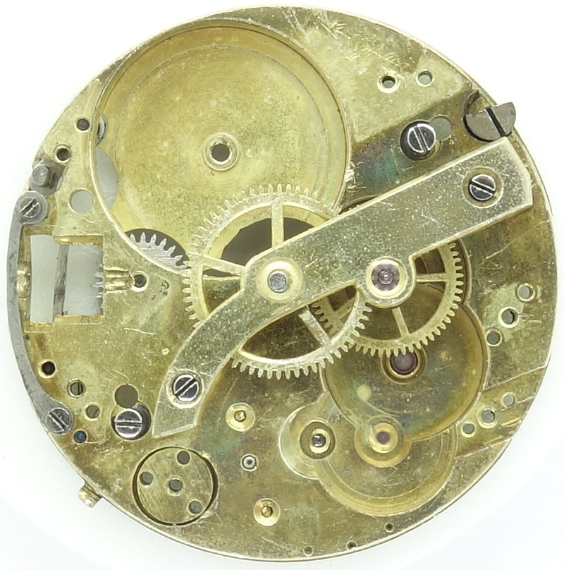 Typisch für die Zeit um 1900 ist der Einsatz eines Kupplungsaufzugs, bei dem mit Hilfe eines kleinen Stifts zwischen Aufzug und Zeigerstellung umgeschaltet wird. Dieser Stift wirkt auf den Winkelhebel bei 2 Uhr ein.