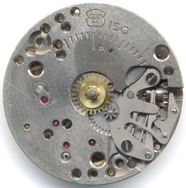 Die Markierung dieses Werks erfolgte jeweils auf der Zifferblattseite, anhand der Kalibernummer kann aber nicht auf die Ausführung der Räderwerksbrücke geschlossen werden, da in allen Fällen “FHF 150” eingestanzt ist.