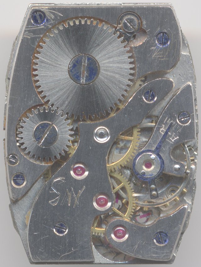 Man sieht hier noch sehr deutlich den alt(modisch)en Werkaufbau mit Ankerradkloben und schmaler Werkbrücke, unter der nur drei Räder gelagert sind.