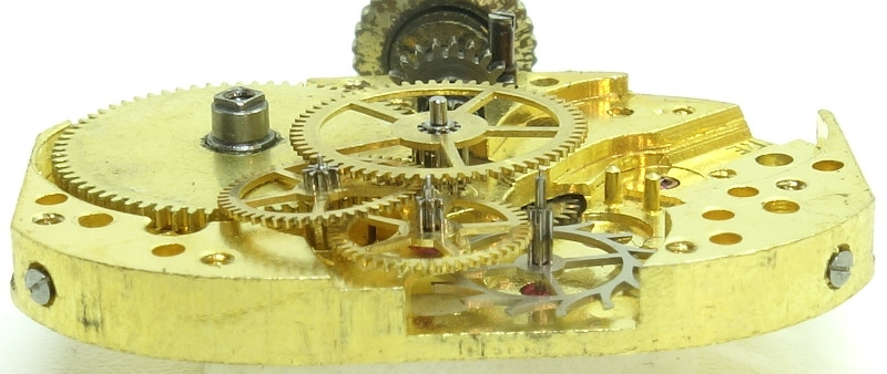Der Aufbau des Räderwerks ist ganz typisch für diese Art Formwerke: Das Federhaus treibt das zentrale Minutenrad an, gefolgt von den recht kleinen Kleinboden- und Sekundenrädern, sowie von dem wieder etwas größeren Ankerrad für die Palettenankerhemmung.