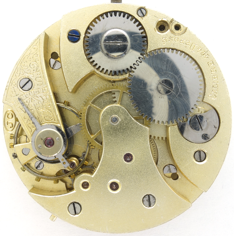 Das nominell 18 Linien messende Taschenuhrwerk Cortebert 474, das es anscheinend im Laufe seiner Bauzeit in leicht unterschiedlichen Versionen gab, ist ein typisches “besseres” Ankerwerk ganz grob aus dem ersten Drittes des letzten Jahrhunderts.