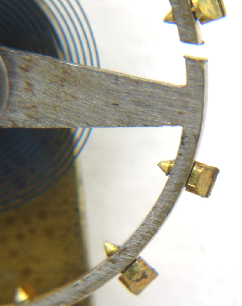 Man sieht auf der goldfarbigen Grundplatine noch schön, wie die Lagersteine umbördelt, also eingefaßt sind. Spätestens ab den 1930er Jahren wurden Steine nur noch gesteckt, ohne Fassung.
