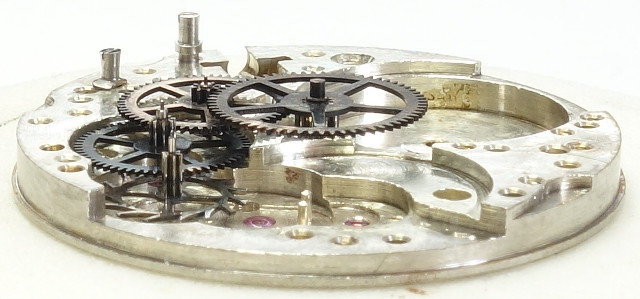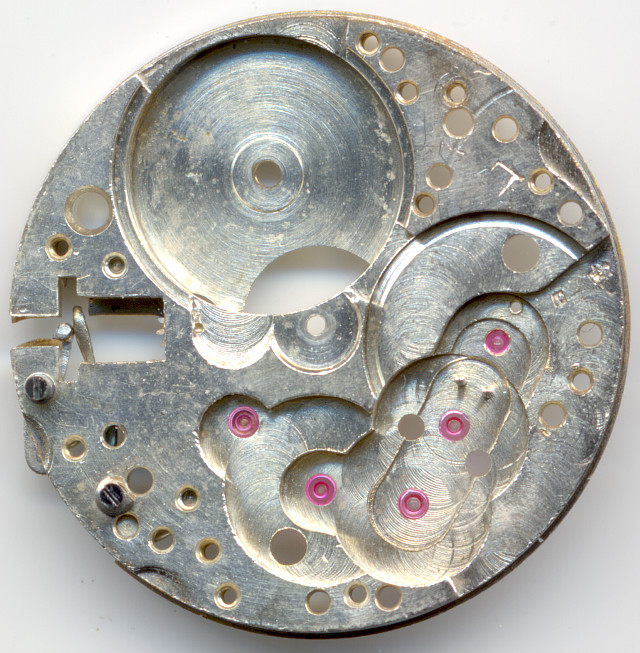 Die Grundplatine läßt bereits die gute Qualität dieses Werks erkennen: Alle wichtigen Räder besitzen Steinlager, in Summe 15 Steine.