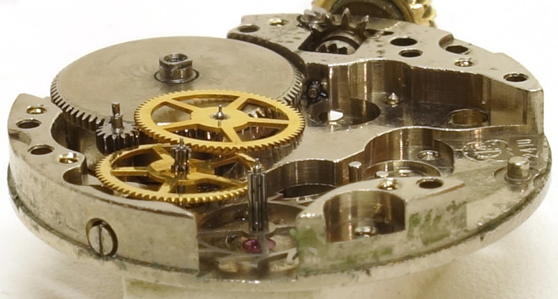 Die Konstruktion des Räderwerks war seinerzeit, um 1960, revoutionär, verzichtete sie doch auf ein zentrales Minutenrad und konnte deswegen ein großes Federhaus und eine große Unruh bieten.