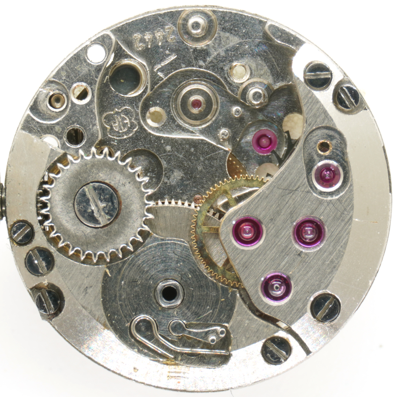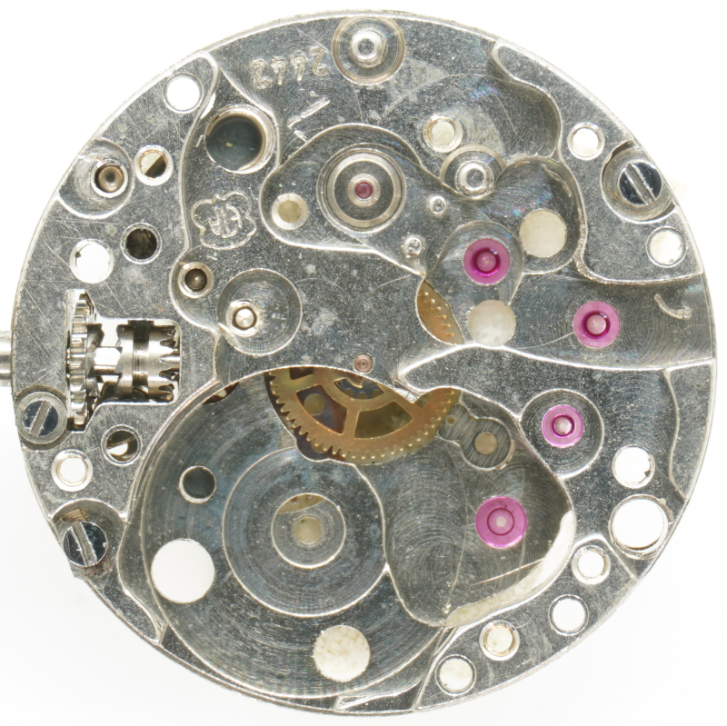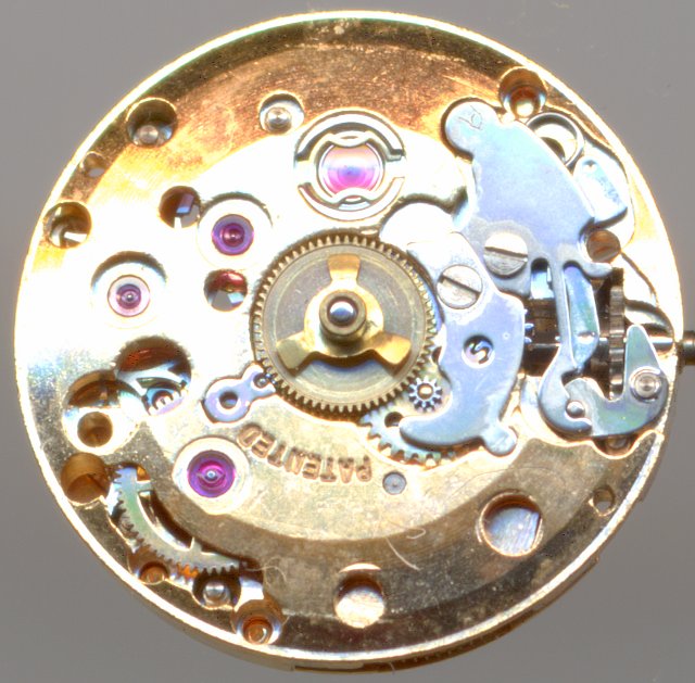 Die Ausführung, die von der Konstruktion her identisch mit dem ETA 2412 ist, ist tadellos, wie man schon an der Grundplatine erkennen kann, bei der natürlich alle wichtigen Lager mit Steinen ausgeführt sind: