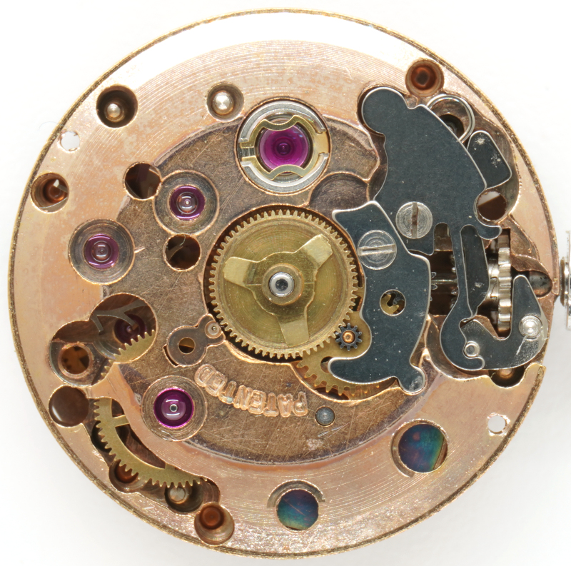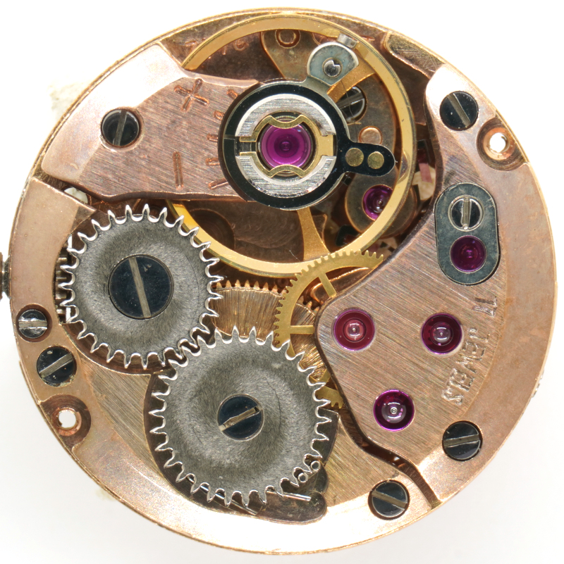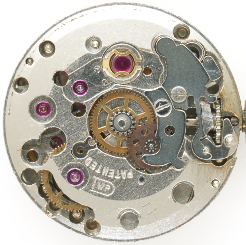 Auch hier wurde die moderne, platzsparende Räderwerksanordnung verwendet, bei der es kein zentrales Minutenrad gibt, sondern das Zeigerwerk über das Trieb des Kleinbodenrads angetrieben wird.