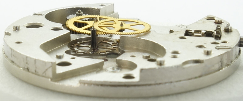 Die Grundplatine des 11 1/2 linigen Werks läßt bereits dessen modernen Aufbau erkennen: Die kleine Messingbuchse im Zentrum des Werks ist nur für die Lagerung der Zentralsekundenwelle gedacht, das Zeigerwerk, bzw. das Minutenrohr wird zifferblattseitig indirekt über das Kleinbodenradlager bei 3:30 Uhr, relativ nah am Zentrum angetrieben. Diese Konstruktion, die vor allem von ETA-Werken bekannt ist, erlaubt ein besonders großes Federhaus, was bei einem Schnellschwinger natürlich von Vorteil ist.