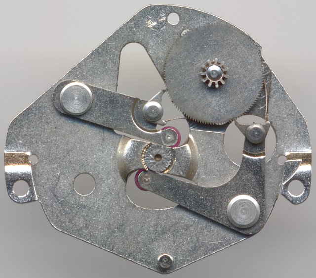 Bei “11 Uhr” erkennt man den Datumsmechanismus mit seinem beweglichen Schaltnocken, der dank der Reibung der Datumsscheibe am Stundenrohr dafür sorgt, daß die Datumsumschaltung ohne jede Feder(!) schnell, innerhalb von einer Stunde, vonstatten geht.