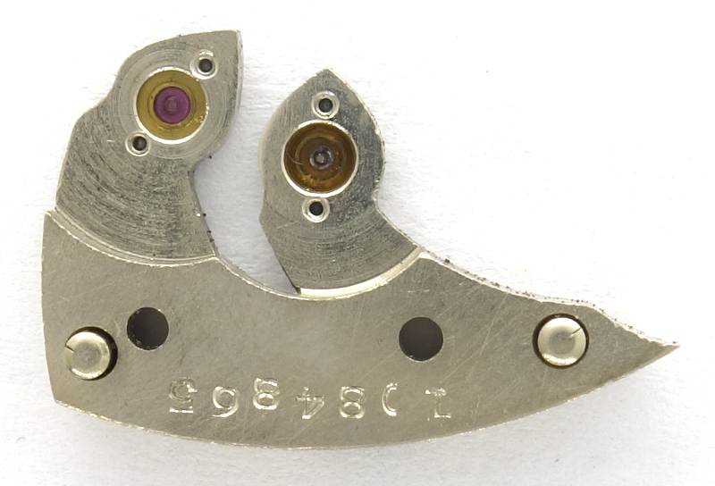 Weiterhin sieht man bei Position 5 Uhr die beiden einstellbaren, auf der Vorderseite exzentrischen, Ankerbegrenzungsstifte - ein Detail, das fast nur bei amerikanischen Werken zu finden ist, bei diesen aber fast überall.