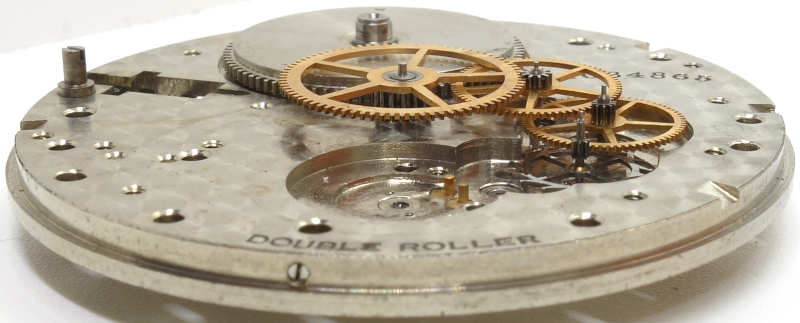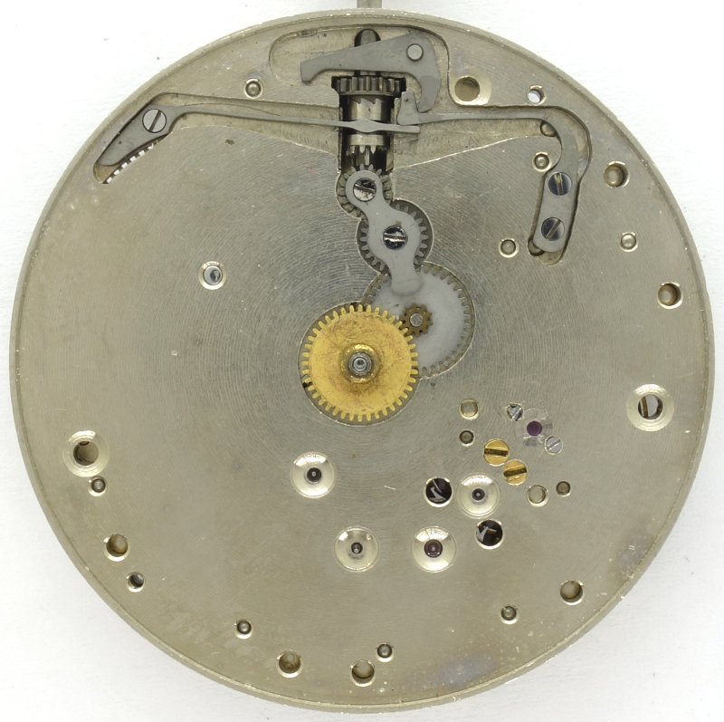 Auf der Zifferblattseite kann man den damals modernen Kupplungsaufzug mit seinen langen Federn erkennen, hier wurde der zur Verfügung stehende Platz gut ausgenutzt.