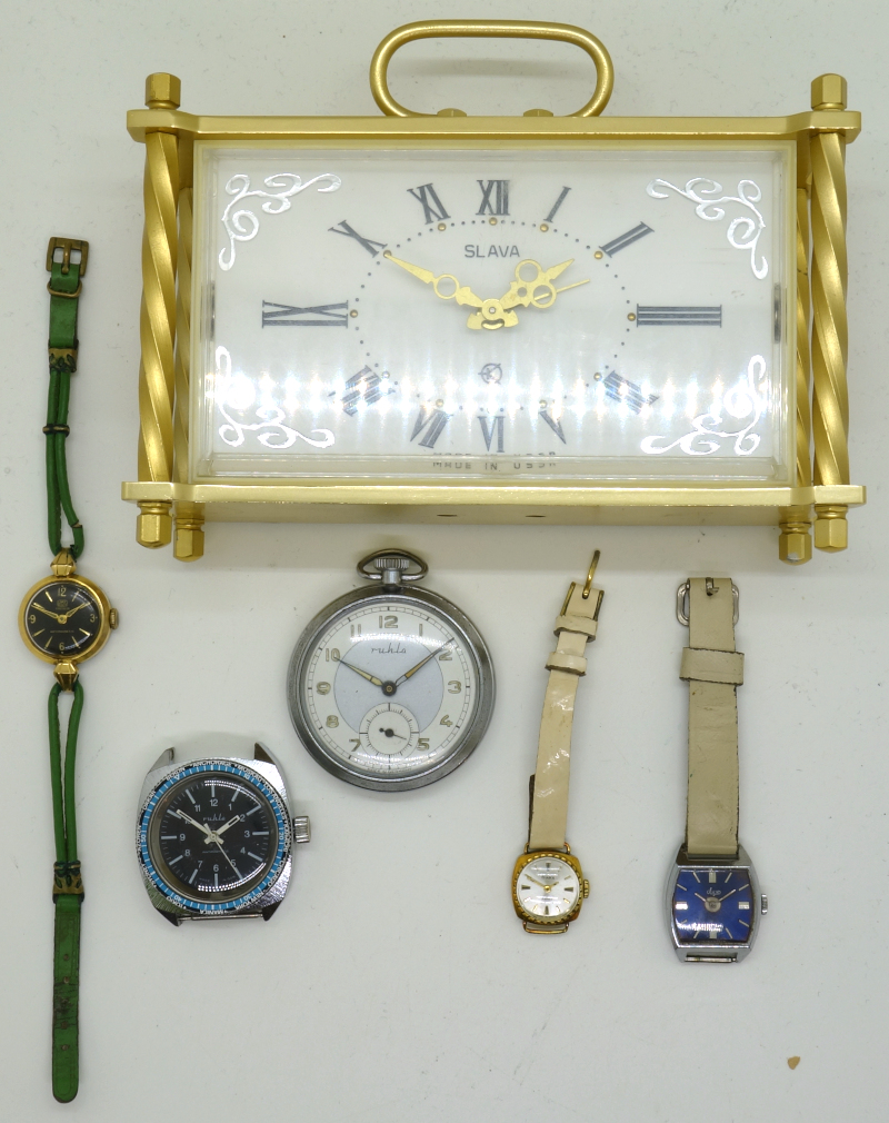 Ein Päckchen voll mit Uhren aus russischer und DDR-Produktion erreichte das Archiv im Februar 2026. Es enthielt ein wundbar erhaltenes Slava 5338, ein Transistor-Drehschwinger mit einem russischen Transistor, dann ein Luch 1800 (bislang nur defekt im Archiv vorhanden), ein Chaika 1601 (ohne “A”-Suffix, und deswegen ein Neuzugang im Archiv), sowie ein funktionsfähiges UMF 24-32 in einem besonderen, wasserdichten Gehäuse mit Weltzeit-Lünette, ein UMF M3 (Diva) und ein UMF 83 (Regular) in der im Archiv noch nicht vorhandenen Variante F2, die nur zwischen 1968 und 1970 produziert wurde.